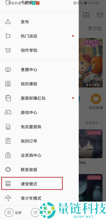 2、打开哔哩哔哩侧边栏之后,点击课堂模式开启;
