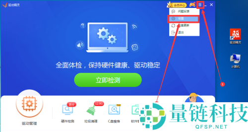 2、进入驱动精灵主界面后,点击右上角三横图标,然后点击“设置”选项,如下图: