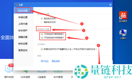 3、最后进入设置主页后,点击“综合设置”,然后右侧找到“修复提示设置”,在下方两个选项“开启系统环境修复提示”和“开启系统软件修复提示”均勾选,即可。