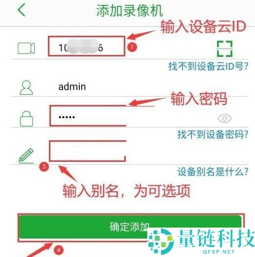 3、最后,输入事先准备好的云ID、输入密码、填写别名等,之后点击“确定添加”按钮即可完成设备添加。