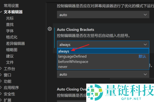 5、最后在下拉项中,选择“always”即可成功地设置自动插入右括号。