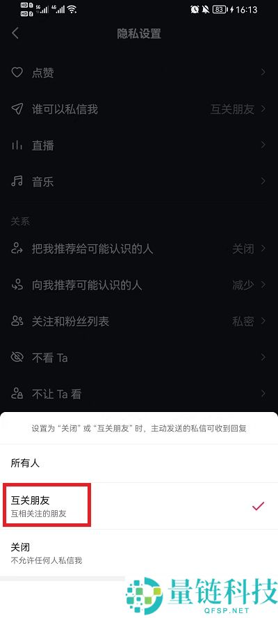 5、在其中可以选择所有人、互关朋友、还有关闭私信,点击用户想要的私信就可以完成设置。