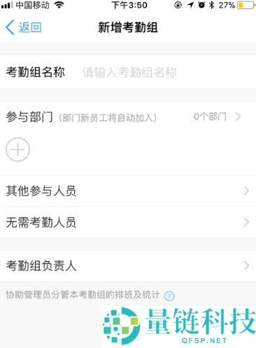 3、之后我们选择新增考勤组,进行设置规则,我们可以设置我们的考勤名称和我们的参与部门和我们的考勤负责人。