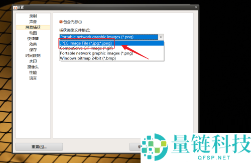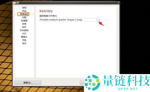 4、在选项设置中选择点击【录屏】,接着点击捕获图像文件格式选项(如图所示)