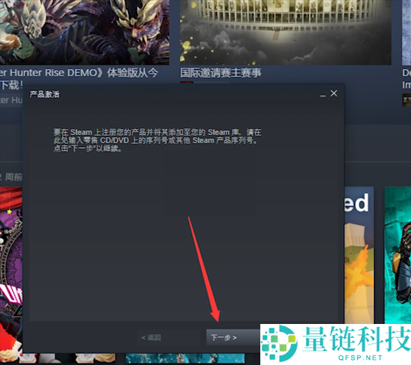 2、最后在激活页面中选择下一步并同意激活条款即可开始输入steam的cdk码,输入完成后选择确定便可将游戏添加到steam账户中。Steam cdk码一经使用完毕就会失效,而且cdk码获得的游戏并不能退款,游戏会在兑换中直接添加进账户。