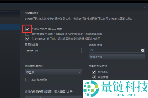 5、在Steam界面中在“取消勾选在游戏中启用Steam界面”选项。