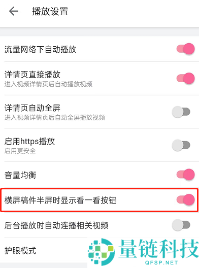 3、最后找到横屏稿件半屏时显示看一看按钮,将右侧开关关闭即可。