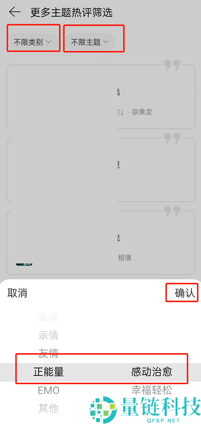 3、最后点击左上角筛选类别和主题,点击确定,即可找到符合要求的热评金句啦。