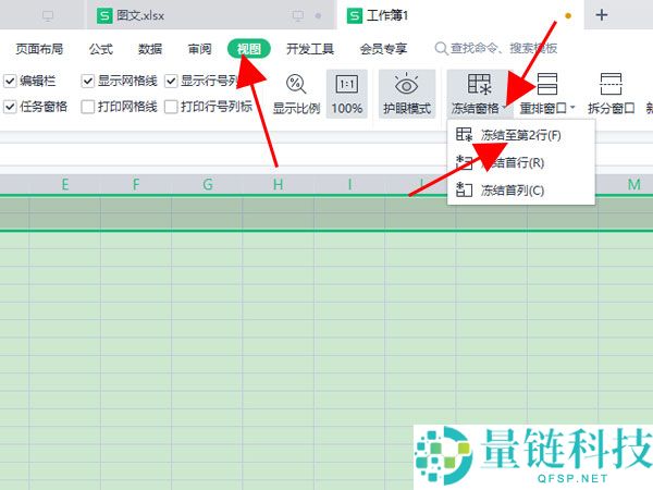 2、然后点击视图,点击冻结窗格下拉三角箭头,点击冻结至首行即可。