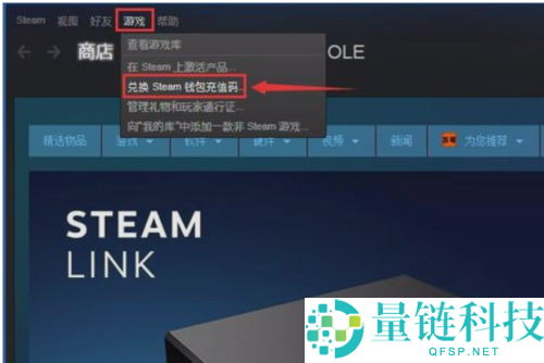 2、登录以后点击steam平台界面左上角的"游戏"菜单,选择"兑换steam钱包充值码..."