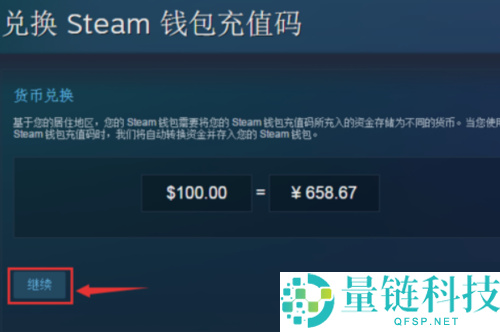 4、接着输入钱包充值码完毕后,点击右侧红色箭头处的"继续"按钮。