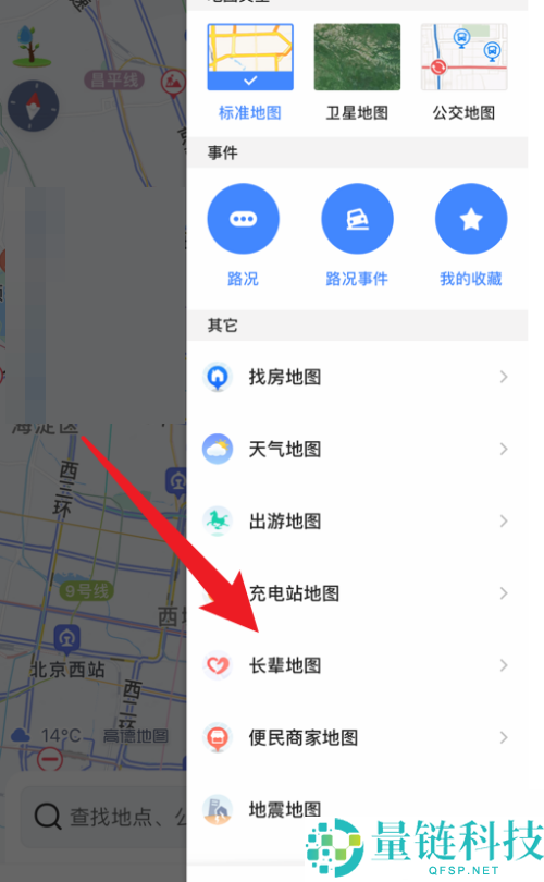 2、然后在弹出的窗口中找到“长辈地图”,点击它。