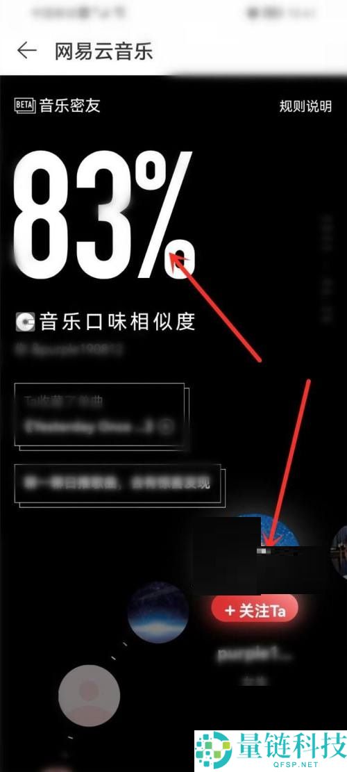4、最后进入音乐密友界面,点击音乐密友头像,可查看口味相似度;点击头像下面的关注,可关注密友。