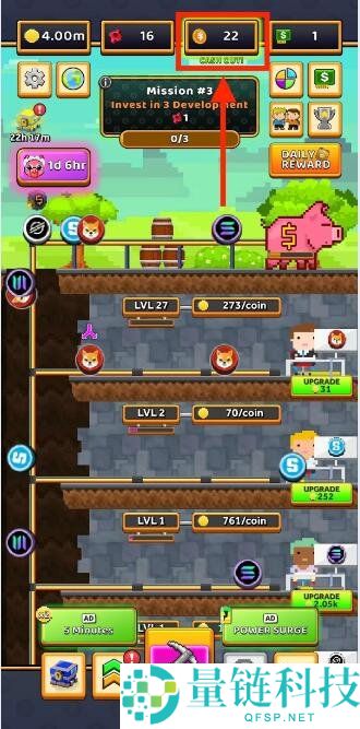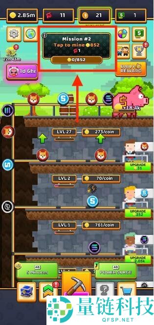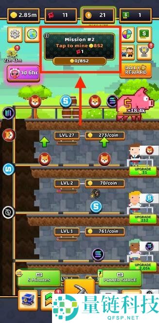 海沃德表示,这是最简单且最稳定的拿奖励方式。游戏首页上方会出现任务(Mission)提示,这些任务包括解锁新挖矿的代币、点击一定数量的道具、升级多个挖矿设备等。每完成一个任务都能拿到节点,也有机会拿到1 个聪的奖励,玩家可优先去解这些任务。