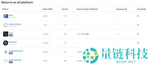 你在选择想赚取哪种币种后,输入预计存入数量,系统可以很快整理出不同DeFi 平台的年度回报率。整理出的DeFi 平台清单中,也会列出安全性评分、目前锁定资产数量,以及综合性评分等资讯。选择完条件后,将可以直接导向该平台。