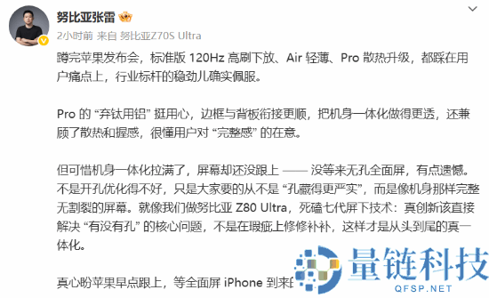 中兴通讯副总裁、努比亚旗舰产品总经理张雷点评苹果发布会:Pro版“弃钛用铝”设计提升一体感,高刷下放和散热升级精准。但他同时指出屏幕