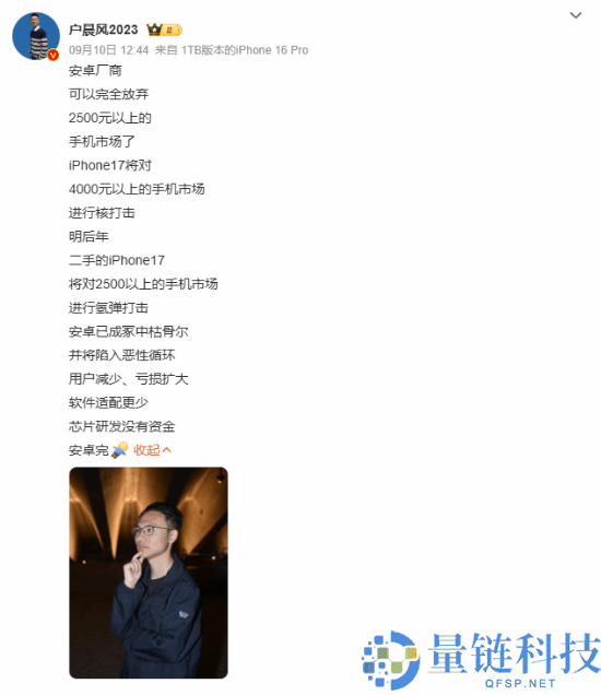 系列正式发布后,网红@户晨风的一段评论迅速引发热议。他在视频中直言,安卓厂商应彻底放弃2500元以上手机市场,因为iPhone
