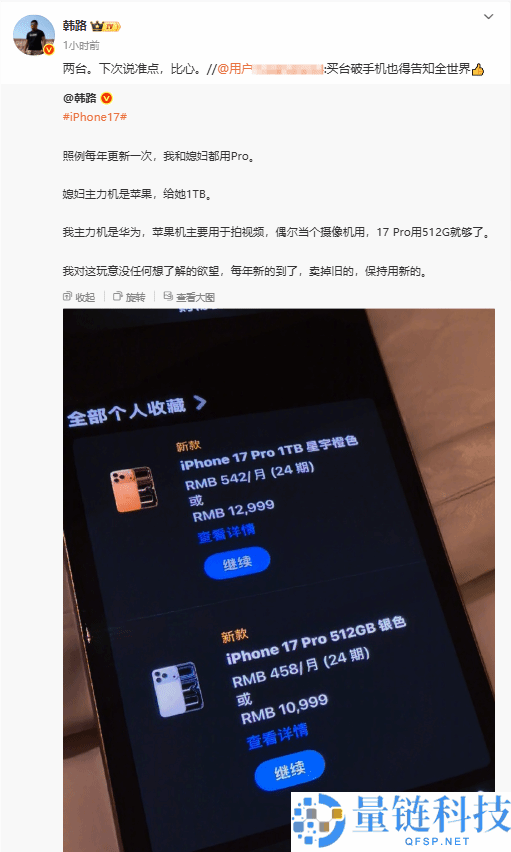 快科技9月11日消息,昨日凌晨,苹果秋季发布会公布价格后,韩路便发微博,收藏了两台iPhone