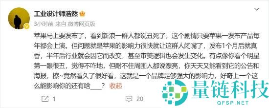 9月8日消息,一加工业设计师刘浩然发文表示,苹果马上要发布了,看到新浪一群人都说丑死了,这个剧情只要苹果一发布产品每年都会上演。但问