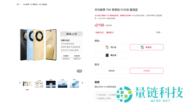 11月21日消息,今日,华为畅享70X尊享版发布,256GB版本首发价1899元、512GB版本首发价2199元,将于11月27日10:08首销。据了解,华为畅享70