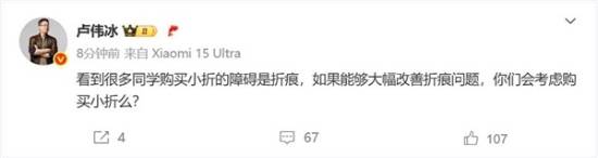 0日消息,小米集团总裁卢伟冰问网友:看到很多同学购买小折的障碍是折痕,如果能够大幅改善折痕问题,你们会考虑购买小折么?从卢伟冰