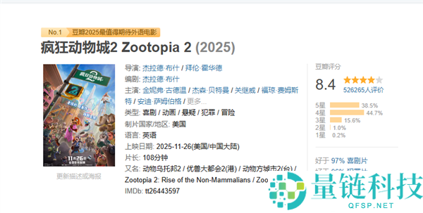 迪士尼动画片子《疯狂生物城2》票房破35亿 豆瓣评分降至8.