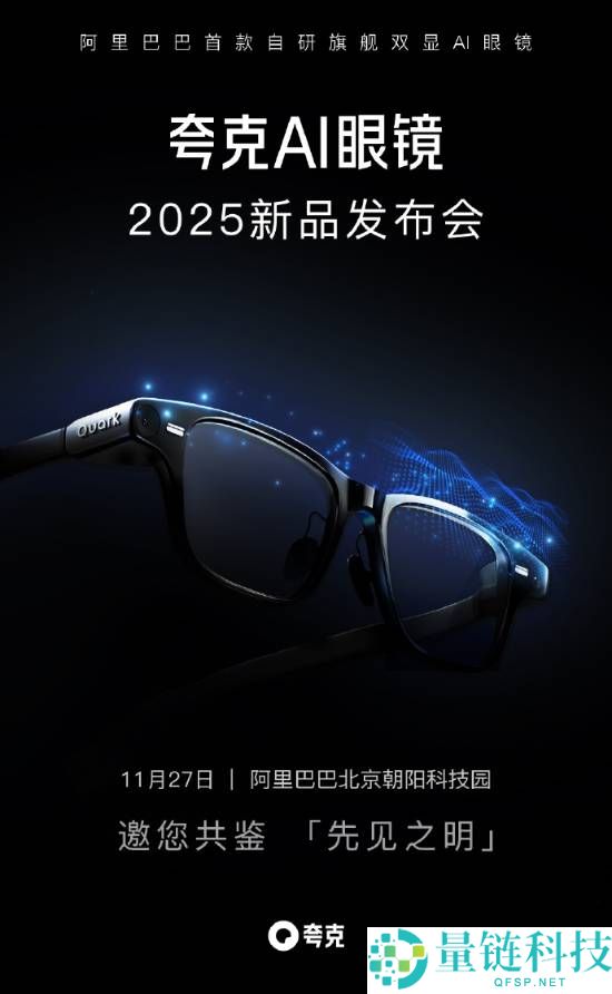 阿里首款自研旗舰双显AI眼镜 夸克AI眼镜S1 11月27日发布