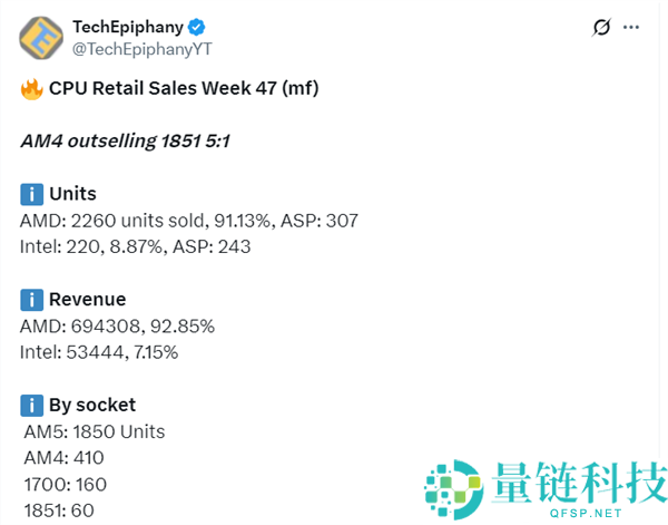 AMD统治CPU市场,9800X3D一延接近Intel全系销量