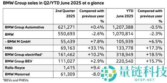 宝马集团日前公布了最新的销量数据。今年二季度,宝马集团全球汽车(包括旗下品牌宝马、MINI和劳斯莱斯)销量达到621,271辆,同比微增0 4%