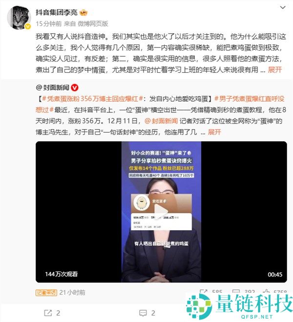“蛋神”凭煮蛋涨粉356万,抖音副总裁李亮否认造神,他走红有三大原因