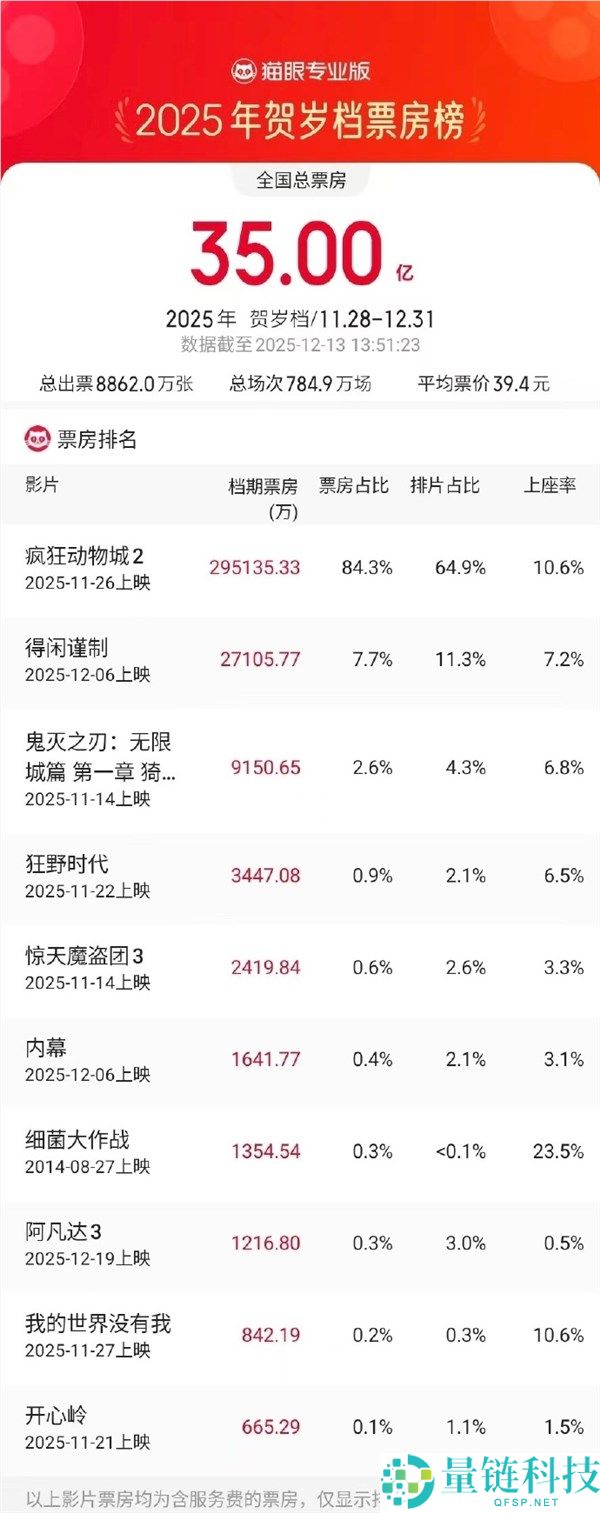 2025贺岁档票房破35亿 《疯狂生物城2》单独奉献近30亿