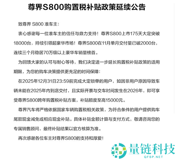 12月2日消息,鸿蒙智行官方今日宣布,尊界S800购置税补贴政策正式延续。作为品牌旗舰车型,尊界S800上市175天大定订单突破1 8万台,11月单