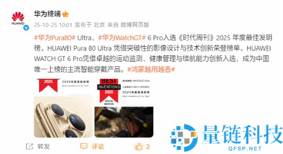快科技10月25日消息,华为终端官微今天发文晒成绩:Pura 80 Ultra、Watch GT 6 Pro入选《时代周刊》2025年度最佳发明榜。华为表示,Pu