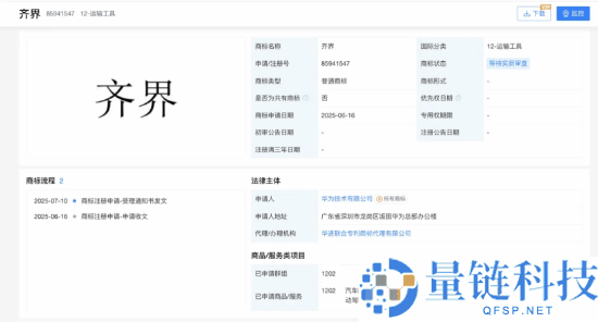 快科技11月12日消息,根据国家知识产权局商标局信息显示,华为技术有限公司于今年申请注册了“齐界”商标,目前处于等待实质审查阶段。该商