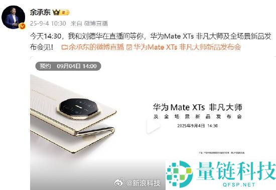 据新浪科技消息,9月4日华为常务董事、终端BG董事长余承东在微博发文预告称,“今天14:30,我和刘德华在直播间等你,华为Mate XTs 非凡大