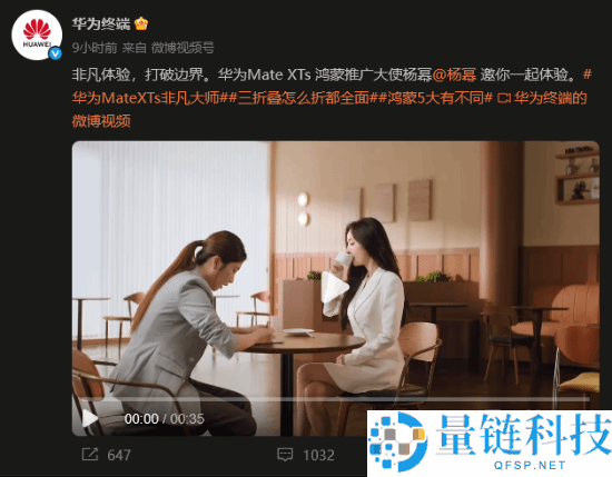 8月29日消息,今天华为终端官方微博发布华为Mate XTs非凡大师预热宣传片。演员杨幂介绍,华为Mate XTs非凡大师改文件、看文件就像用电脑