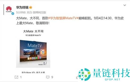 8月29日消息,华为终端官方微博宣布,首款华为智慧屏MateTV将于9月4日14:30亮相,这是华为史上最大Mate,敬请期待。此前在8月20日,华为举