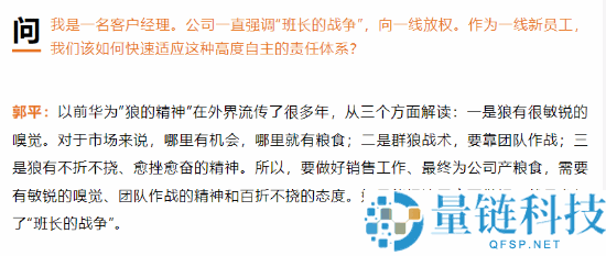 据华为心声社区报道,华为监事会主席郭平在与新员工座谈交流纪要中,从三个方面解读华为“狼的精神”。有新员工问道:“我是一名客户经理。
