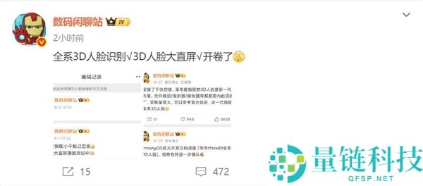 10月27日消息,博主数码闲聊站暗示,华为Mate 80系列有望全版本标配3D人脸识别。该博主称,Mate 80系列的3D人脸识别采用国产方案,元件模