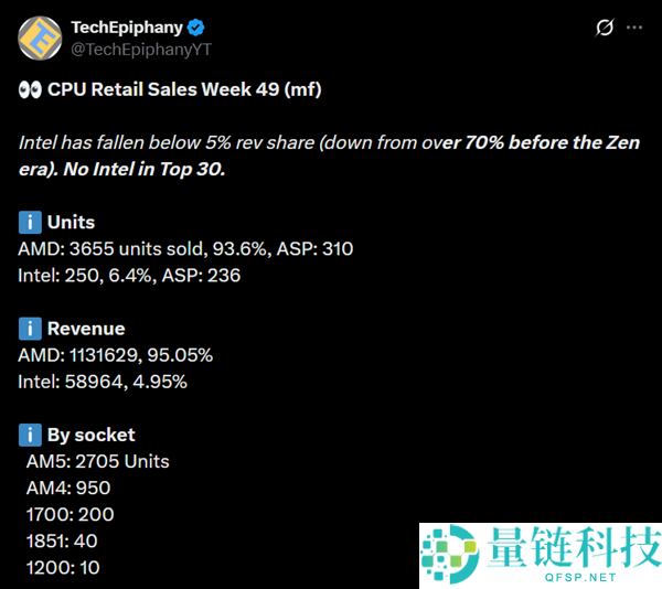 12月10日消息,最新数据显示,Intel CPU在德国零售商Mindfactory上周的收入份额,首次跌破5%。据TechEpiphany分享的Mindfactory 2025年第