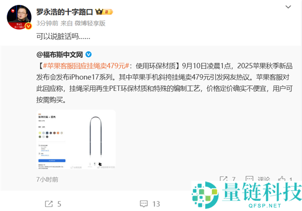 苹果客服回应iPhone 17挂绳卖479元:使用环保材质 罗永浩:可以说脏话吗