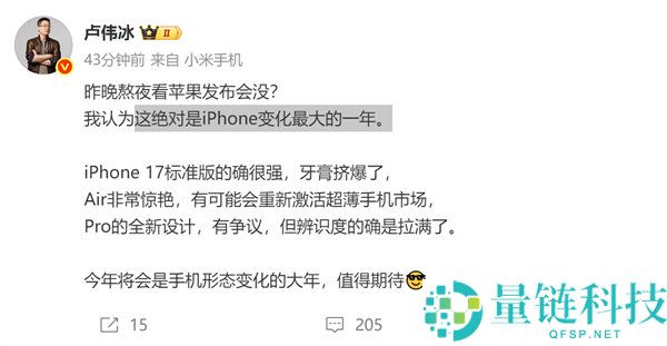 苹果的牙膏“挤爆了”!小米卢伟冰锐评iPhone 17:Air非常惊艳 Pro辨识度拉满