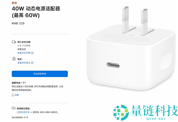 20分钟充50%电!苹果40W动态充电头开卖:最高支持60W、329元、充电线单独买