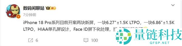 快科技6月19日消息,博主数码闲聊站爆料,iPhone 18 Pro系列开案两块新屏,一块是6 27英寸1 5K LTPO,一块是6 86英寸1 5K LTPO,两块屏