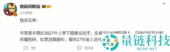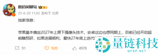 博主@数码闲聊站今日发文披露,苹果“基本确定”2027 年推出(搭载)屏下摄像头技术(的机型)。安卓阵营目前则已经开启“超前瞻”预研,