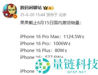 数码博主 数码闲聊站 透露了iPhone 16系列截止至6月15日的国内激活销量,总计2800w+。iPhone 16 Pro Max:1124 5W±iPhone 16 Pro