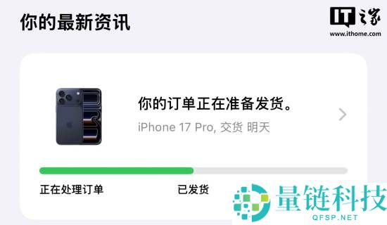 据IT之家小伙伴反馈,在苹果官网 Apple Store 购买的 iPhone 17 Pro 系列预售新机现已开始发货,最早明天送达。苹果中国官网显示