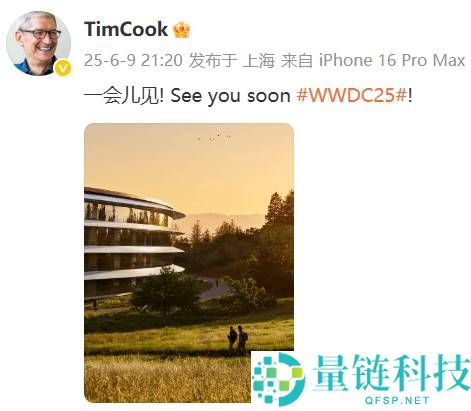 苹果公司CEO蒂姆・库克刚刚在微博发布动态预热即将到来的苹果WWDC25:一会儿见! See you soon苹果全球开发者大会英文全称是“Worldwide