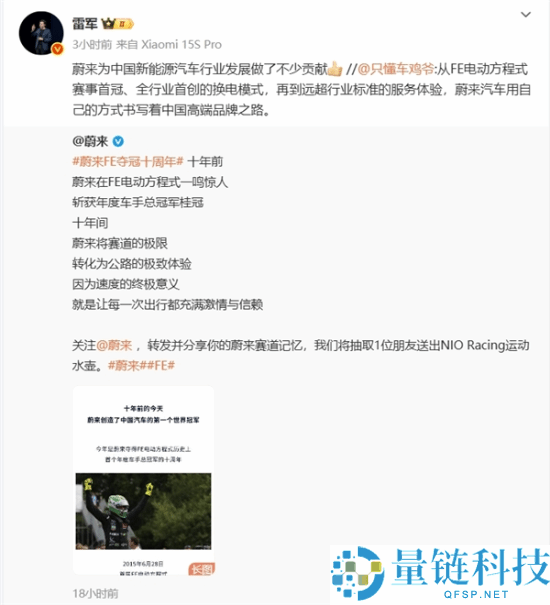雷军称赞蔚来为行业做贡献:中国汽车第一个世界冠军
