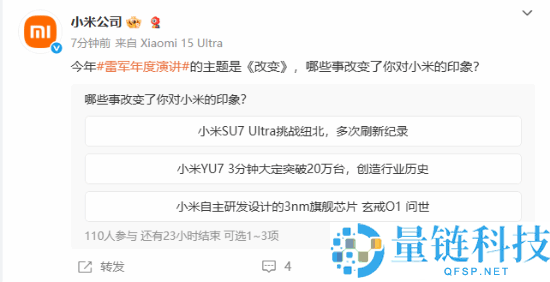 9月25日晚19点,2025年雷军年度演讲将以《改变》为题重磅开讲。小米公司同步在微博发起投票,询问“哪些事改变了你对小米的印象”,三大关